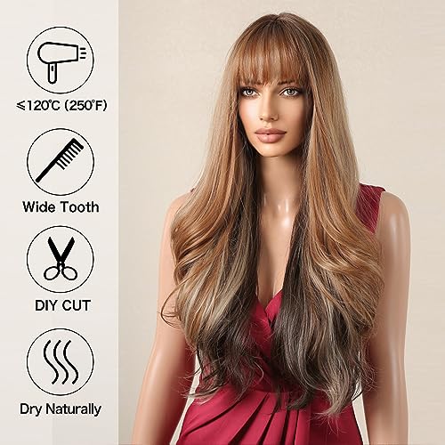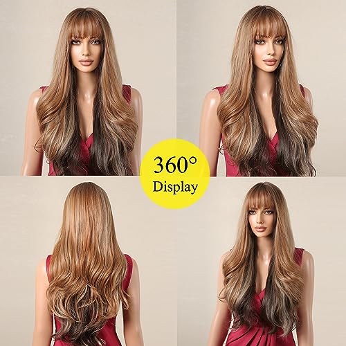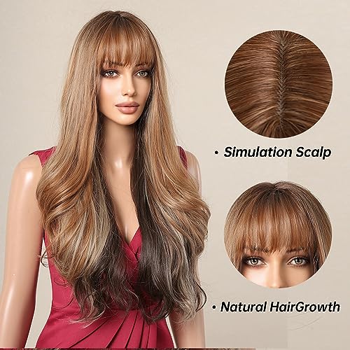 Allbell Parrucche lunghe ondulate ombre marrone miele con frangetta parrucche sintetiche per le donne