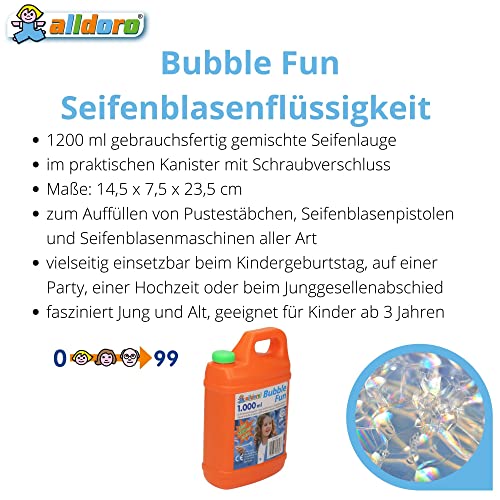Alldoro Bubble Fun 60656 - Liquido per bolle di sapone in tanica da 1200 ml, acqua saponata da 1,2 litri, contenitore di ricarica per bolle colorate e grandi