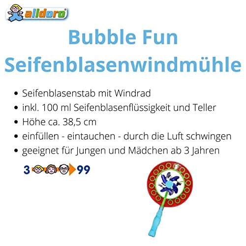 Alldoro Bubble Fun 63060 - Mulino a vento per bolle di sapone, circa 38,5 cm con 100 ml di acqua e sapone, per bambini a partire dai 36 mesi e adulti, blu
