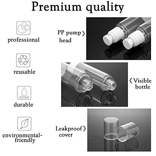 Materiale di alta qualità: le nostre bottiglie a pompa airless sono realizzate in plastica PP trasparente di alta qualità, inodore e piena sicurezza. Fondo spesso progettato per migliorare la stabilità della bottiglia. Pompa a pressione in materiale PP eccellente, durevole e fluida.