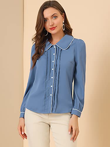 Allegra K Camicetta da Lavoro Donna Tee Shirt Manica Lunga a Sbuffo Scollo a V e Colletto alla Peter Pan Grigio Blu XS