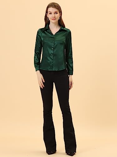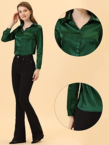 Allegra K Camicia da donna in raso, tinta unita, scollo a V, maniche lunghe, da lavoro, ufficio, camicetta, da donna, Verde scuro, 40