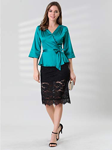 Allegra K Donna Camicetta Peplo Avvolgente Tinta Unita Maniche 3/4 Raso Fiocco Vita Ciano XS