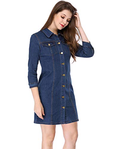 Allegra K Donna 3/4 Manicotto sopra Ginocchio Verso Basso Pulsante Denim Abito Blu L