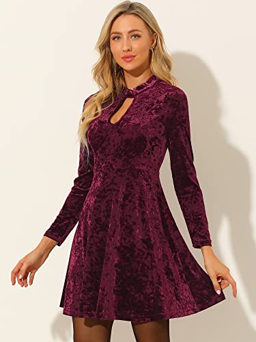 Allegra K Mini abito da donna con scollo a buco della serratura a vita alta a maniche lunghe in velluto, Borgogna, 48