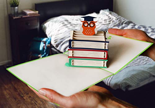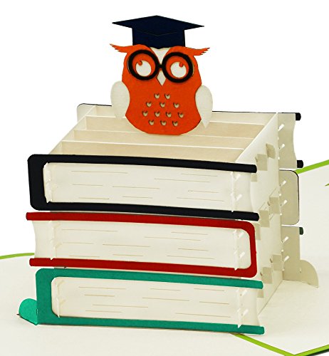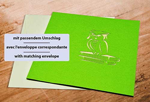 Allegro biglietto per la laurea e gli esami - 3D pop-up card per l'esame con il gufo intelligente per congratulazioni - pop-up card per gli studi, il medico, il diploma di scuola superiore