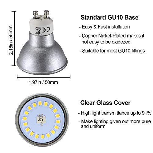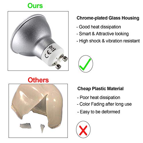 Alta qualità: l'involucro delle lampadine GU10 di Allesgute è realizzato in vetro massiccio con un aspetto metallico, che è buono per la dissipazione del calore ed è anti-shock e vibrazioni. La base standard GU10 è realizzata in rame nichelato, che non si ossida facilmente. Queste lampadine sono approvate CE e certificate RoHS, rendendole sicure sia per l'ambiente che per l'uso domestico.