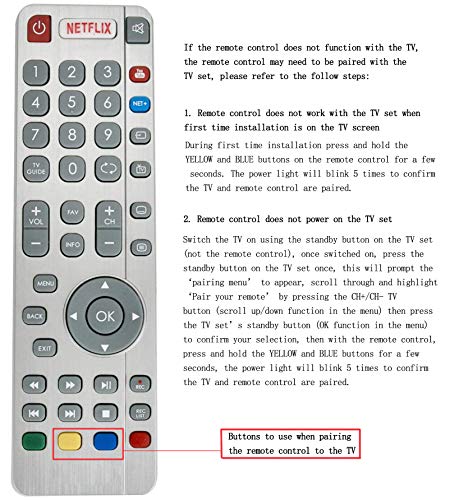 Ciò richiederà di visualizzare il "menu di associazione", scorrere ed evidenziare l'opzione "Abbina il telecomando" premendo la levetta di controllo TV su o giù, quindi premere la levetta di controllo per confermare la selezione. Quindi, con il telecomando, tenere premuti i pulsanti GIALLO e BLU per alcuni secondi, la spia di alimentazione lampeggerà 5 volte per confermare che il televisore e il telecomando sono associati.