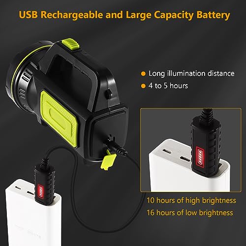 Ricaricabile e uscita USB: torcia a LED con una capacità totale della batteria fino a 6000 mAh, nessuna sostituzione della batteria necessaria, tempo di funzionamento è di 10 ore, ricarica tramite porta USB e la ricarica completa richiede 4-5 ore (2A).