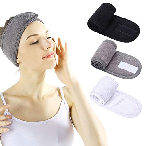 AllRing Fascia per capelli per trucco, spa, con chiusura in velcro, per cosmetici, in spugna, regolabile, per sport, yoga (3 pezzi, nero, grigio e bianco)