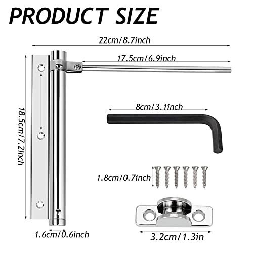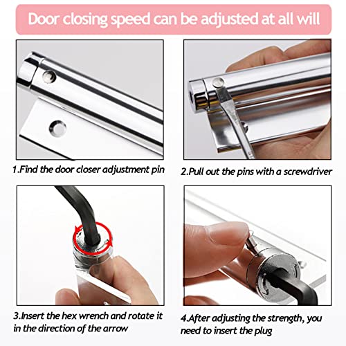 ◼️Facile da installare: questo chiudiporta interno è facile da installare, deve solo essere installato e avvitato tra i telai delle porte. Per prima cosa rimuovi il perno, inserisci e ruota la chiave a brugola nel foro della vite a brugola superiore, quindi inserisci il perno. Regolare la forza richiesta nei sei fori di regolazione in base al peso della porta utilizzata, migliorando l'efficienza e la praticità.