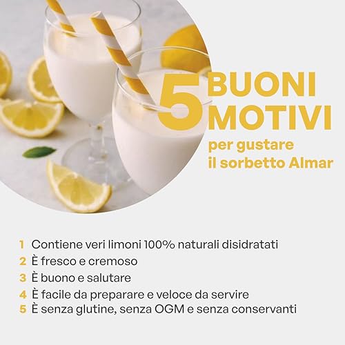 PREPARATO IN POLVERE PER SORBETTO: il Sorbetto al limone Amalfi di Almar è fresco e cremoso e contiene succo naturale disidratato di veri limoni dal profumo suadente. E' buono e salutare e ti permette di gustare un prodotto soffice e vellutato senza glutine, senza OGM e senza conservanti