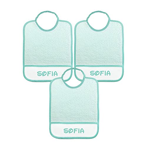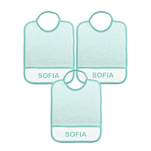 ALMATEX SRL 3 bavaglini personalizzati con nome misura maxi cm.29x36 in spugna con elastico e tasca raccogli briciole personalizzata con nome - 100% cotone - made in italy (VERDE)