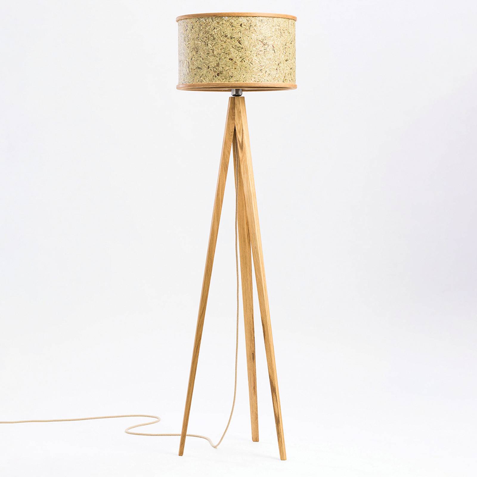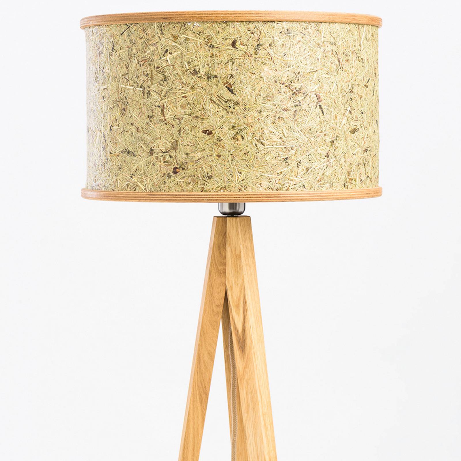 Lampada da terra in legno a tre gambe 2610 con paralume in vero fieno alpino Con la sua estetica naturale, la lampada da terra della serie 2610 è una fonte di luce accogliente e piacevole. Vengono utilizzate materie prime naturali - legno di quercia chiaro per il telaio a tre gambe, fieno pressato per il paralume cilindrico;