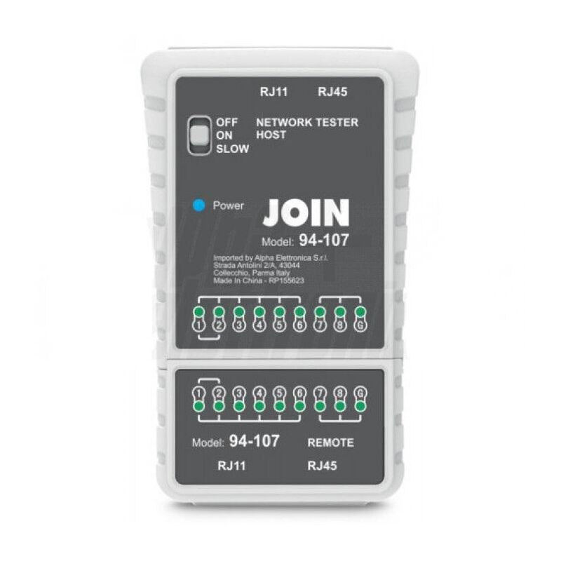 94-107 TESTER COLLEGAMENTI CAVI LAN Questo tester dal design compatto (con ricevitore estraibile) è uno strumento indispensabile per verificare con facilità il corretto cablaggio di cavi di rete lan RJ45 e telefonici RJ11/RJ12.E' dotato di 9 spie luminose (sia per trasmettitore che per ricevitore) per verificare la continuità del cavo e la corretta polarità dei connettori.Idoneo per cavi a doppino intrecciato schermati e non schermati.Verifica la continuità del cavo ed errori di cablaggio (cortocircuito o in circuito aperto)Una volta connesso spostate l'interruttore su “ON” o “SLOW”, le spie luminose si illumineranno indicando la corrispondenza dei pin.Modalità ON per un test a velocità normale.Modalità “SLOW” per un test a bassa velocità. Caratteristiche generali Temperatura operativa: -20~60°CUmidità operativa: 80% maxTemperatura di stoccaggio: -10~50°CUmidità di stoccaggio 80% maxAltitudine