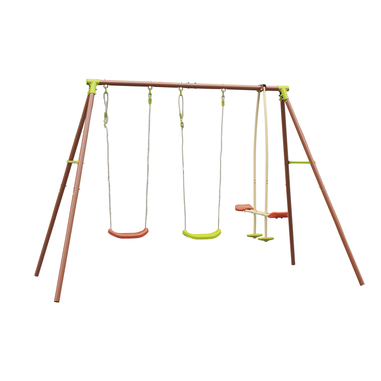 L'altalena è uno dei giochi più amati dai bambini quando li porti al parchetto! Se lo spazio non ti manca, potrai creare un personale parco giochi nel tuo giardino: i tuoi figli si divertiranno tantissimo a dondolare sui comodi seggiolini e potranno anche invitare gli amici per organizzare feste di compleanno e pomeriggi davvero unici, senza muoversi da casa. Oltre a due altalene singole è composto da un'altalena a dondolo doppia. Assicura ottima solidità grazie alla struttura in acciaio con tubi da 50/45 mm. I due seggiolini presentano due colori diversi per rendere l'altalena ancora più vivace e divertente. Portata massima: 60 kg per ogni seggiolino. Dimensioni: 269x195x153 cm.