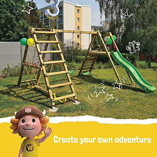 Altalena WICKEY Smart Shake gioco per bambini con scivolo verde e ampliamento per l'arrampicata, altalena doppia in legno da esterno o da giardino