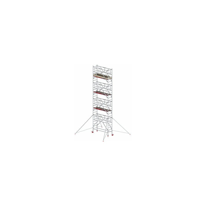 Trabattello mobile RS TOWER 41 stretto con Safe-Quick®, piattaforma in legno, lunghezza 2,45 m, altezza di lavoro 9,20 m. Fornitura = smontato. Larghezza piattaforma = 750 mm. Altezza piattaforma = 7200 mm. Lunghezza piattaforma = 2450 mm. Altezza di lavoro = 9.2 m. Altezza di salita = 7200 mm. Altezza trabattello = 8.2 m. Peso = 230 kg. Materiale = alluminio, legno. Portata = 200 - 750 kg. Zavorra per esterni = 40 kg. Diametro ruote = 200 mm. Larghezza trabattello = 0.8 m. Lunghezza trabattello = 2.4 m. Diametro tubo = 50 mm. Norma = EN 1004 classe 3. Tipo di prodotto = trabattelli mobili. Trabattello stretto - particolarmente adatto per aree strette. Sicuro e stabile - con rotelle pivottanti con fermo doppio. Robusta protezione completa con Safe-Quick® GuardRail. Per l'impiego in ambienti interni ed esterni. Conformi alla nuova TRBS 2121-1. L'RS TOWER 41 è un trabattello mobile completo. Perfetto per ogni professionista. Con questo trabattello si può lavorare fino a un'altezza