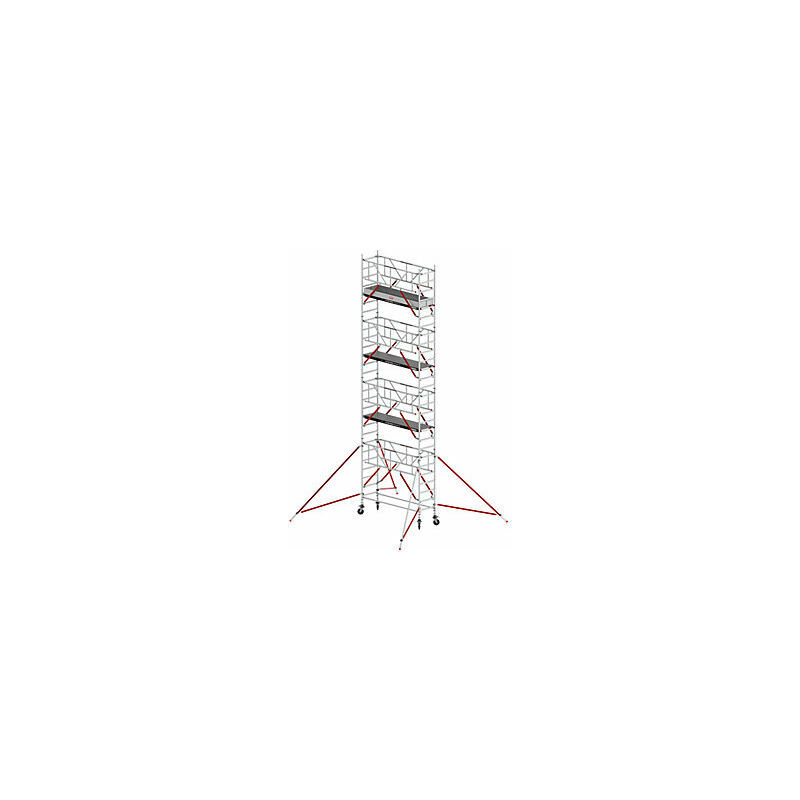 Trabattello mobile RS TOWER 51 stretto, con piattaforma in Fiber-Deck®, lunghezza 2,45 m, altezza di lavoro 9,20 m. Fornitura = in parte smontato. Larghezza piattaforma = 750 mm. Altezza piattaforma = 7200 mm. Lunghezza piattaforma = 2450 mm. Altezza di lavoro = 9.2 m. Altezza di salita = 7200 mm. Altezza trabattello = 8.2 m. Peso = 237.93 kg. Materiale = alluminio, Fiber-Deck®. Portata = 250 - 750 kg. Zavorra per esterni = 120 kg. Diametro ruote = 200 mm. Larghezza trabattello = 0.8 m. Lunghezza trabattello = 2.5 m. Diametro tubo = 50 mm. Norma = EN 1004 classe 3. Tipo di prodotto = trabattelli mobili. Le piattaforme in Fiber-Deck® sono più leggere del 30%. Trabattello stretto - particolarmente adatto per aree strette. Montaggio e smontaggio più rapidi con l'innovativo sistema di ganci della piattaforma. Conformi alla nuova TRBS 2121-1. L'RS TOWER 51 è un trabattello mobile su cui poter costruire, sia in ambienti interni che esterni. Il sistema può essere esteso con tutti i componenti