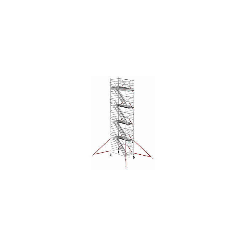 Trabattello con scale RS TOWER 53 largo, piattaforma in legno, lunghezza 1,85 m, altezza di lavoro 10,20 m. Fornitura = smontato. Larghezza piattaforma = 750 mm. Altezza piattaforma = 8200 mm. Lunghezza piattaforma = 1850 mm. Altezza di lavoro = 10.2 m. Altezza di salita = 8200 mm. Altezza trabattello = 9.2 m. Peso = 355 kg. Materiale = alluminio, legno. Portata = 250 - 750 kg. Diametro ruote = 200 mm. Larghezza trabattello = 1.35 m. Lunghezza trabattello = 1.9 m. Diametro tubo = 50 mm. Norma = EN 1004 classe 3. Tipo di prodotto = trabattelli mobili, trabattelli per scale. Telaio transitabile per accedere facilmente al trabattello. Trabattello mobile con scale incorporate. Con l'RS TOWER 53 è possibile creare la propria impalcatura individuale. E fino ad un'altezza di 14,2 m all'interno e all'esterno. Con i telai larghi 1,35 m e un carico fino a 250 kg per piattaforma, questo trabattello con scale è ideale se si deve portare con se materiale o attrezzi sull'impalcatura e si deve quindi