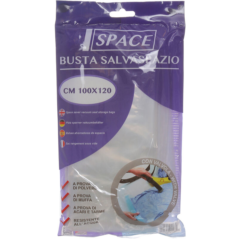 La linea Space ti offre la soluzione perfetta per organizzare al meglio il cambio dell'armadio. Il sacchetto sottovuoto e impermeabile ti permette di riporre i tuoi capi occupando il minimo spazio all'interno del tuo guardaroba e anche in valigia. La busta in plastica trasparente, a prova di polvere, muffa, acari e tarme, è dotata di valvola per il sottovuoto. Ti basterà porre i capi all'interno del sacchetto e rimuovere l'aria con l'ausilio di un aspiratore: otterrai un risultato perfetto e potrai posizionare la busta in cassetti e vani occupando pochissimo ingombro .