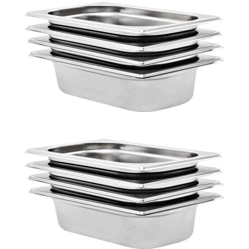 Questi contenitori Gastronorm impilabili saranno un'ottima aggiunta ai vostri accessori da cucina. Realizzata in acciaio inossidabile e robusto, la teglia da cucina a vapore ha una costruzione solida ed è facile da pulire. Il materiale resistente evita i graffi e facilita la manutenzione. La teglia per alimenti ha le dimensioni standard dei formati Gastronorm, consentendo così un uso universale e un ampio campo di combinazioni. In particolare si adatta perfettamente a tutti gli elettrodomestici da cucina e le attrezzature professionali come bagnomaria, scaldavivande e buffet di insalate. Questi contenitori sono impilabili e possono essere nascosti per risparmiare spazio, inoltre sono molto pratici e ideali per l'utilizzo in ristoranti, alberghi, feste e a casa. La consegna include 8 contenitori per alimenti. Colore: Argento GN 1/4 Dimensioni: 265 x 162 x 65 mm (L x P x A) Materiale: Acciaio inossidabile Volume massimo: 1,8 L La consegna include 8 contenitori per alimenti SKU: 50901