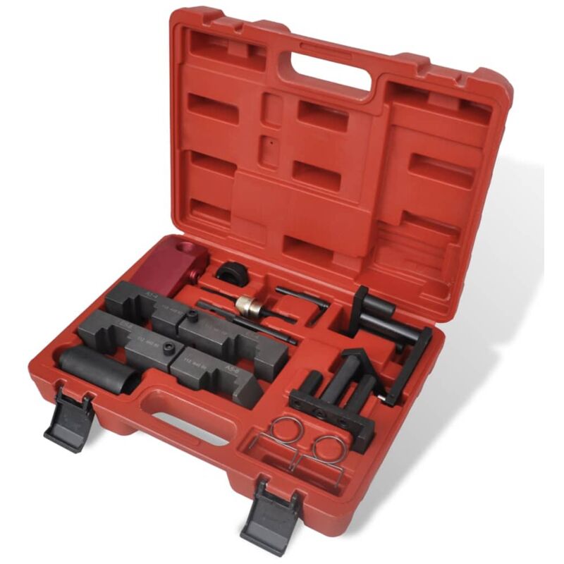 Questo set di strumenti per la fasatura del motore con una scatola porta attrezzi è progettato per una vita a lungo termine nel garage o per l'uso quotidiano nelle officine meccaniche. Consente la corretta temporizzazione durante la sostituzione della cinghia dentata. Questo set è adatto per l'uso su motori BMW M60 / M62. Realizzato in acciaio al carbonio, il pesante set di strumenti di temporizzazione è rivestito per prevenire la corrosione e garantisce una durata eccellente. Con questo set di strumenti, la rimozione, la sostituzione, il bloccaggio e le altre riparazioni del motore possono essere effettuate facilmente ed in modo sicuro. Il set contiene gli strumenti di temporizzazione necessari per la regolazione e l'impostazione del tempo del motore. Il set completo comprende: apparecchi di chiusura dell'albero a camme VANOS e strumenti per la fasatura, prese di valvole Electroagnetic, staffe di tensionamento VANOS, perni di fasatura VANOS e prese di regolazione. Tutti gli strumenti