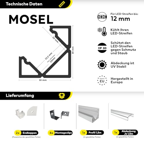 Alumino | Profilo in alluminio a LED bianco | 150 cm | accessori inclusi | profilo angolare | Semi copertura | per strisce LED da 12 mm | Mosel