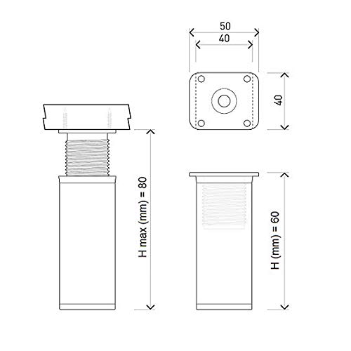 ️ ALTA QUALITÀ. I piedi sono costruiti sulla base di profili di alluminio anodizzato 40x40 mm e due cappucci di chiusura. Un'estremità è dotata di un campo di regolazione di 20 mm. L'altra estremità è costituita da una base in plastica fissa. La capacità di carico delle gambe è di 120 kg per set di 4 pezzi