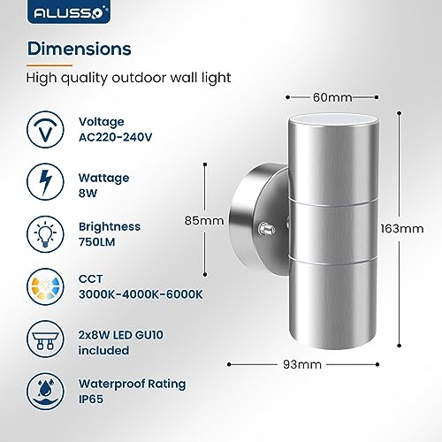 ALUSSO Applique per esterni, luce su e giù in acciaio inossidabile, lampadina LED GU10 2x8W inclusa, 3 colori commutabili, luce di sicurezza esterna argento IP65 per portico del corridoio