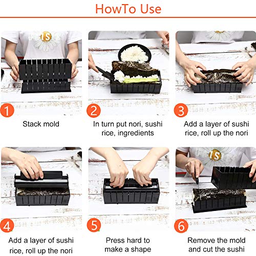 Facile da avviare: vieni con istruzioni passo passo, aggiungi prima il nori sulla base dello stampo e riempilo con riso e i tuoi ingredienti preferiti negli stampi (non è necessario arrotolarli), quindi premerlo nello stampo forma, e puoi ottenere il tuo meraviglioso sushi giapponese fatto in casa a casa