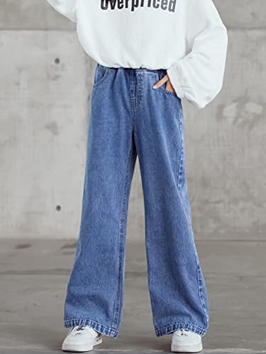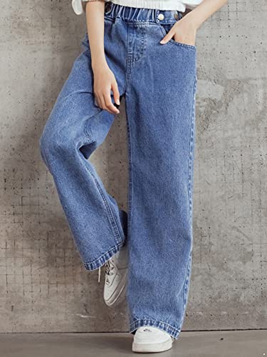 Alvivi Jeans Bambina Pantaloni Larghi a Vita Alta Ragazza Denim Straight Elastico Cotone Blu Strappato Estivo Pantaloni Lunghi in Stile di Strada Casual Eleganti Vivid Blue 9-10 Anni