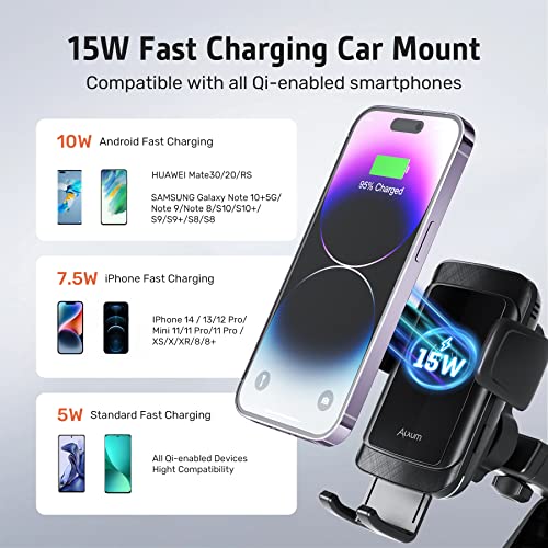 Alxum 15W Qi Caricatore Wireless Auto, Porta Cellulare Auto Wireless Supporto Telefono, Supporto di Ricarica Wireless Automatico Intelligente per Auto per Presa d'Aria, Cruscotto e Altro