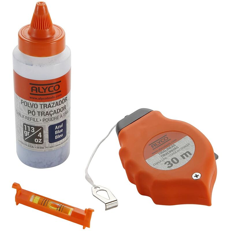 Set di tiraline in corda intrecciata lunga 30 m con tanica di polvere 123 g e piccola livella lunga 75 mm, tiraline con manovella per raccogliere la corda, corda con fermo metallico.