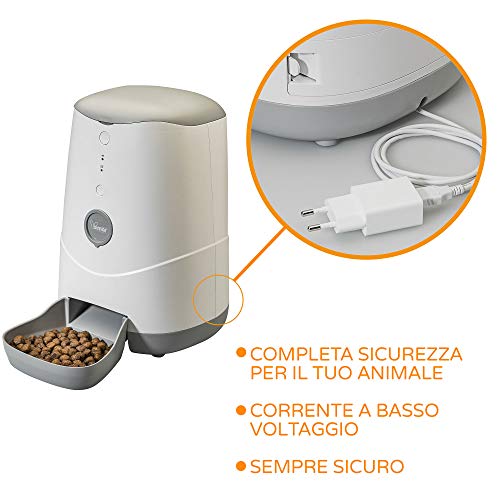 CARATTERISTICHE - dispenser cibo gatti Contenitore per crocchette da 3,7L, rimovibile, lavabile, e con blocco apertura del coperchio. Ciotola rimovibile e lavabile. LED che avvisa quando rimane il 20% di crocchette nel contenitore. Adattatore AC / DC (incluso nella confezione)