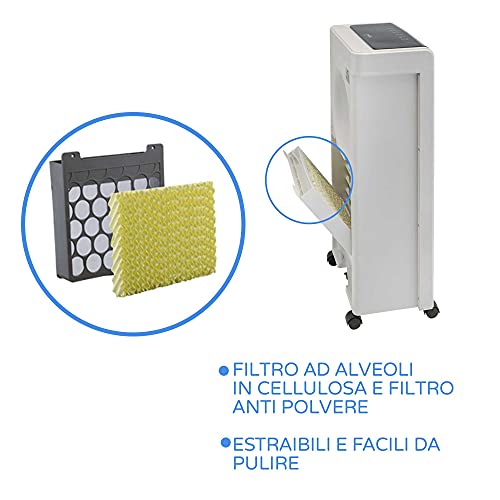 Il filtro in fibra di cellulosa ad alveoli viene costantemente irrorato d'acqua e, grazie a questo, l' aria che lo attraversa viene pulita e raffreddata. Il pre-filtro trattiene le impurità maggiori. Entrambi sono rimovibili e lavabili.