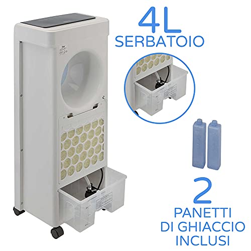 Il serbatoio di 4 litri con indicatore di livello, garantisce fino a 12 ore di aria fresca e permette di abbassare la temperatura a seconda delle condizioni dell'ambiente e umidità relativa. 2 panetti di ghiaccio in gel inclusi.