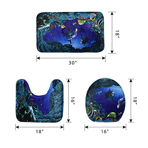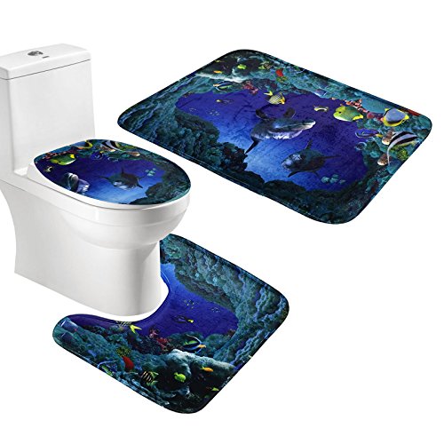 Amagical - Tappetino da bagno, tappetino da wc e fodera per copriwater, set da 3 pezzi, in flanella morbida, Flanella, Sea fish, 45*75cm