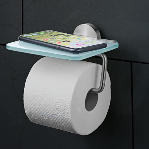 AMARE Lussuoso porta rotolo di carta igienica, con ripiano in vetro, 13,8 x 16 x 11,5 cm, in acciaio inox, colore argento