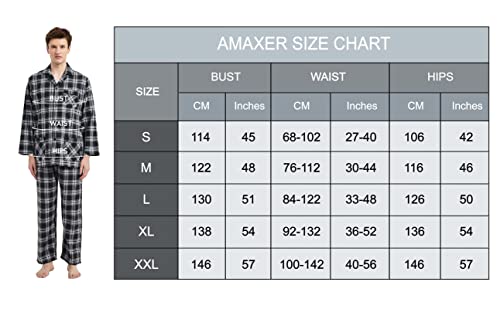 Amaxer Pigiama Cotone Uomo Lungo 100% Flanella Invernale Indumenti da Notte Top a Manica Lunga con Tasche Pantaloni con Coulisse,Plaid Nero Bianco Blu XXL