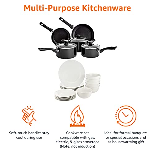 Amazon Basics 5-Piece Non Stick Induction Cookware Set - Including Frying Pan, Saucepan, Casserole with Lids and 18-Pcs Dinnerware Service for 6