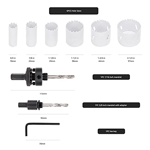 Include sei seghe a tazza nelle dimensioni: 19 mm, 22 mm, 29 mm, 38 mm, 44 mm e 57 mm;