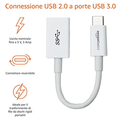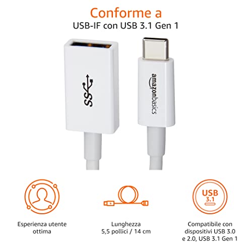 Amazon Basics Cavo convertitore da USB-C a USB-A 3.1 Gen 1 adattatore femmina, velocità 5 Gbps, certificazione USB-IF, per laptop, tablet, telefoni, bianco