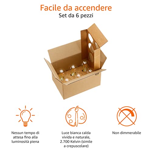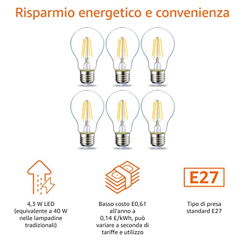 Amazon Basics - Confezione da 6 lampadine a LED, con attacco Edison E27, piccole, da 4,3 W (equivalenti a 40 W), con filamento in vetro trasparente, non dimmerabili, bianca calda