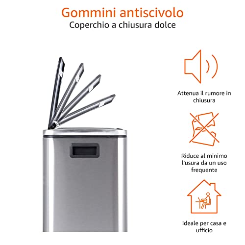 Amazon Basics Pattumiera 30 L (2 x 15 L) Rettangolare con due scomparti e pedale in tubo d'acciaio - chiusura ammortizzata con coperchio, per cucina, bagno o ufficio, in acciaio inossidabile
