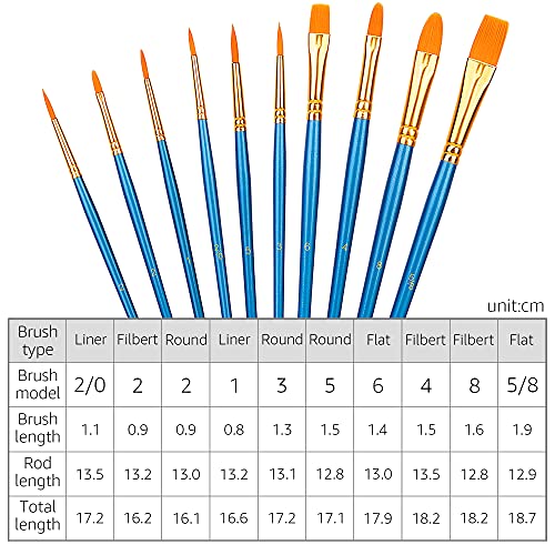 Ogni set include: Pennelli per dipingere, in 10 diverse misure e 4 diverse forme, inclusi pennelli a punta tonda, filbert, piatti e liner/rigger