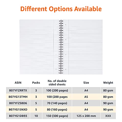 Amazon Basics Quaderno con rilegatura a spirale, 100 fogli, formato A5, 80 g/m², 200 pagine, (confezione da 3)