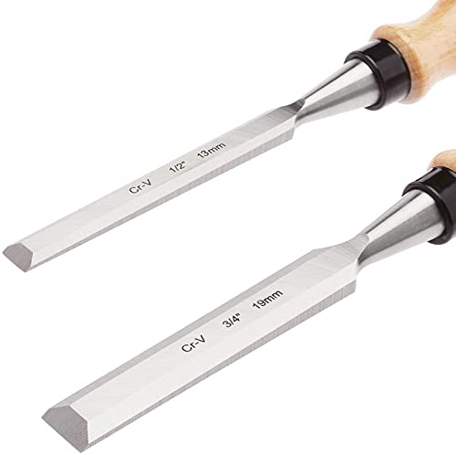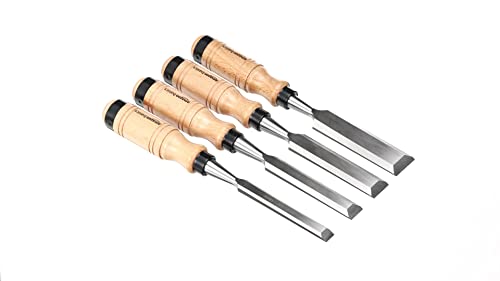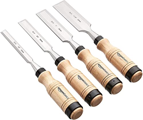 Amazon Basics - scalpelli per la lavorazione del legno in robusto acciaio al cromo vanadio, 4 unità, 1/2" - 1.25", con manico in legno e custodia