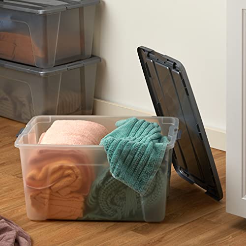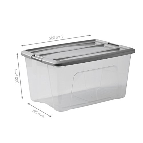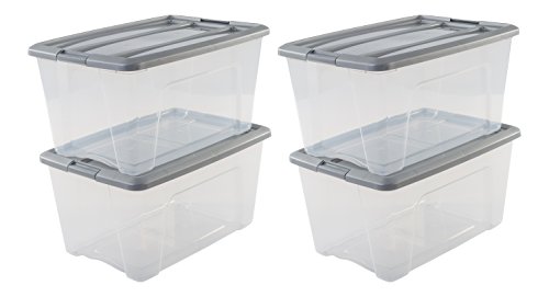 Amazon Basics, Set di 4 scatole di immagazzinaggio, 45 L, con chiusura a scatto, impilabile, soggiorno, camera da letto, garage - New Top Box NTB-45 - Argenteo / Transparente