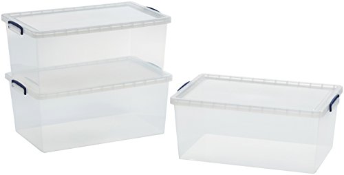 Amazon Basics - Scatole portaoggetti in plastica trasparente, con coperchi, 62 l, confezione da 3